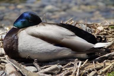 Keywords: drake sleep duck mallard duck bird water bird animal world nature poultry plumage relaxed relaxation wing close males bird rest lake pond water bank