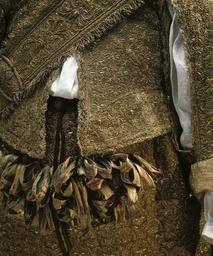 | Keywords: Dräkt från 1600-talet - Livrustkammaren - 55963.tif LSH artwork sv Förmodligen tillverkad i Frankrike Buren av Karl X Gustav 1622-1660 i samband med kröningen <br/>I 1671 års inventarium står En Klädningh som är gjord till H K Maij tz Lÿcklige Cröningh och sägs omfatta följande plagg nämligen kappa tröja byxor knäband skorosor och handskar I 1654 års klädkammarräkning förtecknas dräkten under nr 3 på följande sätt 1 klädning och kappa av filemort gul oskuren sammet helt broderad med guld och med 140 diamantknappar till tröjan och byxorna 1 par strumpeband och skoband av rik guldbrokad helt broderade med guld 1 par underbyxor av incarnadie rosa taft och silkesstrumpor av samma färg 1 guldbroderat med guld och stofferade med guldbrokad 1 panasch plym av couleur de feu röda filemort och aurorafärgade fjädrar 1 par förgyllda sporrar och 1 värja med förgyllt fäste <br/>Nu finns endast tröjan och byxorna i behåll i sitt skick som dräkt medan den stora rundskurna kappan inte längre omtalas i inventarierna efter 1691 1704 års inv säger inget om kappan men den finns förvandlad till mässhake och altarbrun i Riddarsholmskyrkan Skänkta dit den 1 april 1705 av Riksänkedrottningen Hedvig Eleonora Mässhaken Gjord av tjock gul rips OBS Fel Enl Sveriges kyrkor skall vara sammet oskuren ett material som skiljer sig från såväl tröjans som byxornas Broderad med mönster i guld på samma sätt som på tröjan och byxorna Mönsterrapport 8 x 8 cm Såväl fram- som bakstycket består av 2 hopsydda våder av c a 40 cm bredd max längd ca 90 cm Drottningens namnchiffer HRS samt ANNO 1705 har broderats på respektive fram- och baksidorna <br/>Tröjan är sydd av vad man med ett modernt namn skulle beteckna som guldlamé som helt täckts med guldbroderi Den är av s k innocenttyp d v s ett relativt kort livplagg med planschetter inlagda som styvnad i framstyckenas snibbiga främre hörn försett med 10 små skört ståndkrage och relativt korta ärmar med öppna sömmar framtill På vänster framstycke har 17 st 2 cm knapphål sytts med jämna mellanrum ca 1 cm från kanten Vad man bör lägga märke till är att tröjan sytts av ett större antal stycken som skarvats samman Förmodligen har plagget antingen redan varit i tidigare bruk före kröningen 1654 och blivit något förtrångt eller också har man misslyckats med passformen vid tillfället i fråga och har varit tvungen att göra en del ändringar Möjligheten att tröjan kan ha förändrats vid något senare tillfälle kan man inte heller bortse ifrån <br/>Bottenmaterialet består nämligen av två skilda lamétyger ett något gulare i de smalare skarvarna och f ö ett något rödare det egentliga materialet Tröjan är huvudsakligen skuren i 2 framstycken 2 ryggstycken samt 2 ärmstycken till vardera ärmen 10 skört samt krage Man kan alltså visa att framstyckena måste skarvas med remsor av det gulare tyget utefter de raka framkanterna samt även i sidsömmen I halsringningen har en liten kil satts in mellan det vertikala skarvstycket fram och axelsömmen Bakstyckena ha fått var sin vertikala skarv knappt 4 cm bred mitt i ryggen på ömse sidor om mittsömmen Utefter ärmarnas öppna långsidor har vertikala stycken fogats till och nere vid ärmens avslutning har på undersidans stycken en smal horisontell remsa sytts På överärmstycket däremot har en horisontell skarv satts in överst uppe vid ärmringningen Kragen är också uppklippt baktill och försedd med 2 små skarvstycken Det 3 e skörtet på varje sida är eventuellt nysytt ty dess färg förefaller ljusare broderiet är klumpigare och kompositionen annorlunda mot alla de övriga 8 som exempelvis har den lilla blomman nedtill i mitten <br/>Mönstret har i någon mån missuppfattats i de senare sydda styckena så har man t ex lagt krepiner och trådar i båge i stället för att klippa av dem och börja med en ny tråd Ärmarnas nedersta parti mellan 3 5-7 cm är lämnat utan broderi beroende på att det ju skulle vikas till uppslag Ärmarna har inga knappar eller knapphål intill sprunden vid handlederna I midjan sitter på insidan under skörten 8 st små tampar med vardera 2 hål för byxornas hakar Guldlamén har en vådbredd av minst 31 cm utan stad 45x15 tr/cm2 Varje inslag består av gult silke med 2 och 2 smala trinda guldtenar på rätan <br/>Analysresultat <br/>Metalltråd tvinnad med textiltråd huvudbeståndsdelar <br/>Silver xxx<br/>Guld x<br/>Koppar xxx<br/>Zink 0<br/>Det yttäckande läggsömsbroderiet består av kantiljer av trinda tenar och platta lan av olika bredd snodder med silkeskärna omtvinnade med guldlan strängar dragna av trinda tenar av guld eller silver som stansats ut i spiraler eller öglor och manglats platta på halva sidan här benämnda spiral- eller paljett strängar i brist på befintlig terminologi och 2 och 2 tätt liggande strängar med trinda smala guldtenar virade runt ett bredare guldanklätt snöre etc Broderiet är nersytt med gult silke Mönsterraporten är 6 5x6 5 cm Mönstret Ur 2 från varandra utåtböjda palmkvistar som strax nedanför mitten sammanhålles med en uppåtböjd båge växa omväxlande 5- och 8-flikiga icke naturalistiska blommor upp <br/>Analysresultat <br/>Metalltrådsbroderi huvudbeståndsdelar <br/>Silver xxx<br/>Guld xxx<br/>Koppar xxx<br/>Zink 0<br/>Tröjan är garnerad med en 2 3 cm bred knypplad uddspets av guldtråd med 2 inlagda guldlan Mönsterrapporten är c a 2 5 cm Spetsen sitter på bägge främre ytterkanterna knapparna har alltså suttit ovanpå spetsen och fortsätter därifrån omedelbart runt de 2 främre skörten Vidare sitter det spets runt de 3 ytterkanterna av varje skört på axel-och sidsömmarna runt ärmhålen och längs de öppna ärmsömmarna sprunden Den ursprungliga knäppningen finns inte längre kvar diamantknapparna lät änkedrottningen ta ur och använda för annat ändamål Numera knäppes tröjan med hyskor och hakar Av viss