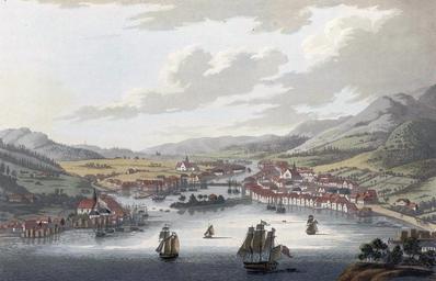 | Keywords: Dram (JW Edy plate 71).jpg Artwork Creator John William Edy en Dram No LXXI DRAMEN The towns of Bragernaes and Stromsoe and the suburb of Tangen are generally known by the more familiar name of Dram or Dramen Their site is in a beautiful valley on the banks of the navigable river Dram which arises at the foot of the Tillefield mountains After wandering through a vast country receiving many streams and passing over cataracts and through several lakes it divides these towns in its way to the Fiord and onward to the sea This view was taken below the town of Bragernaes near the highroad leading to Christiania looking between the hills up the vale towards Eger and Kongsberg On the right hand side of the print are seen the town and church of Bragernaes The bridge over the river Dram connects it with Stromsoe whose large church is more elevated and is situated in the centre of an extensive church yard enclosed by a wall At the west end of this town a small bridge connects the suburb called Tangen having its church and being traversed by the road to Konsberg These towns contain many good houses inhabited by wealthy merchants and prosperous traders The population is considerable and an extensive trade is carried on in timber iron copper cobalt Prussian blue from Fossum skins c c The deal trade alone employs annually on an average 150 ships which are supplied with cargoes from 44 saw-mills at Eger Travellers pass through on their way to the west or to the silver-mines at Konsberg and the post returns from thence over this bridge monthly laden with the specie dollars coined there for Copenhagen Immediately from the foreground on the right is an ascent to the famous Paradise mountain; the road to Christiania winds over its lofty summit A little way up this mountain the towns and adjacent country are seen to great advantage as shewn in the print; and the fertilized vale with its golden corn and silver stream awakes the traveller's recollection to favourite scenes in warmer climates and he readily admits that this mountain deserves the name of Paradise hill given to it by the Norwegians The view from its summit is too vast and extensive to create any other emotion than astonishment Near the top are the famous marble quarries a small village and an inn Here also resides a farrier ; a useful man on this difficult road The water at Dramen is so deep that ships can arrive in full sail at the bridge above which the river is navigable for boats only There are on it several small pleasant and inhabited islands with houses trees and gardens on them The churches and houses are generally good and spacious but the streets are narrow The dwellings nearest the mountains have decorated gardens In the environs are many villas and country seats The country around Dram is extremely pleasing to the view but it is dangerously infested with wolves foxes and bears The dogs wear spiked collars Among their domestic animals the people here have a remarkable species of tame blue cat Through the stream that waters these towns the salmon proceed to the famous cataract and leap above where the fishermen have been known to catch 1200 annually Horses are numerous here and of a good figure and condition owing to the great quantities of pasture land in the valley The place is salubrious and provisions including many foreign luxuries are abundant and reasonable Collapse bottom http //urn nb no/URN NBN no-nb_digibok_2011072910001 Boydell's picturesque scenery of Norway London 1820 Plate no 71 p 357 in scanned copy no-nb_digibok_2011072910001 PD-Art-100 John William Edy Boydell's picturesque scenery of Norway Drammen in art Drammenselva |