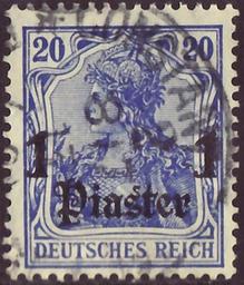 | Keywords: DRAus 1905 Türkei MiNr0838 B002.jpg German Post in the Ottoman Empire stamp of 1905 Michel No 87I ; Deutsches Reich ; with double lines horizontal black overprint in Gothic letters 1 / Piaster / 1 <br /> Stamp German Post in the Ottoman Empire; Michel No 38; AFA No 38 DR-TYR <br /> Color ultramarine to violet-blue<br /> Nominal value 1 Piaster on 20 Pfennig <br /> Watermark Germany No 1 rhombs <br /> Postage validity - 1905 1914-09-30 <br /> Postmark Constantinopel other date 1913-07-08 scan of original 1905 first issue of the stamp <br /> other date 1913-07-08 date of postmark Deutsche Reichspost - Deutsche Post in der Türkei PD-Ottoman Empire PD-Germany-§134-KUG 1917 Anna Führing with imperial crown; with black overprint of the Ottoman currency 1905 Deutsche Reichspost - Deutsche Post in der Türkei Creator Paul Eduard Waldraff Reichsdruckerei Berlin letterpress printing comb perforation K 14 14¼ Deutsches Reich - Deutsche Auslandspostämter Türkei Nr 38 1905 stamps of Germany for the Ottoman Empire 38_2 Overprints on Germania stamps Istanbul in the 1900s |