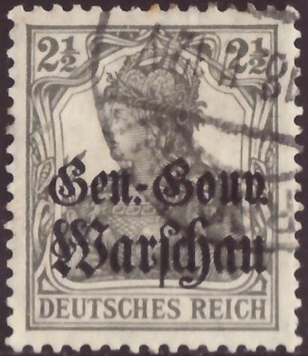 MAKE A MEME View Large Image DRBesG 1916 War MiNr06 B002.jpg Stamp of the German Empire - German occupation areas 1914/18 - Poland; definitive stamp Germania-issue war press with black two lines overprint in German letters Gen -Gouv / Warschau for the ...