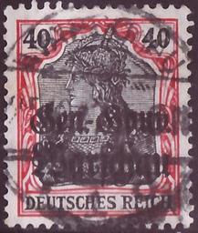 | Keywords: DRBesG 1916 War MiNr15b B002a.jpg Stamp of the German Empire - German occupation areas 1914/18 - Poland; definitive stamp Germania-issue war press with black two lines overprint in German letters Gen -Gouv / Warschau for the General-Gouvernement Warschau striped background<br /> Stamp Michel No 15b German Empire Nr 90IIb 1914 with overprint ; Yvert Tellier No 15 Poland PL-OA <br /> Color lilac red / brownblack or black<br /> Watermark Germany No 1 rhombs <br /> Nominal value 40 Pfennig <br /> Postage validity - 1916-08-01 1918-12-28 <br /> Postmark Warschau other date 1917-10-25 scan of original other date 1916-08-01 first issue day of the stamp <br /> other date 1917-10-25 date of postmark Deutsche Reichspost - Deutsche Post in Polen PD-Germany-§134-KUG PD-Polish 1917 <gallery> File DR 1915 90 II Germania jpg The same stamp without overprint Michel No 90II war press mint striped background color variant </gallery> Philately Germania-issue war press with black two lines overprint in German letters Gen -Gouv / Warschau other date 1916-08-01 Deutsche Reichspost - Deutsche Post in Polen Creator Paul Eduard Waldraff Reichsdruckerei Berlin letterpress printing comb perforation K 14 14¼ Deutsche Besetzungausgaben 1914/18 Deutsche Post in Polen Nr 15b 1916 stamps of Germany for Poland 15_b_2_1 Overprints on Germania stamps Red stamps |