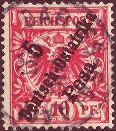 | Keywords: DRCol 1896 DOA MiNr08 B002.jpg Stamp of the German empire - German colonies - German East Africa 1898 Reichspost - Imperial eagle in circle with three-lines black overprint<br /> Stamp German empire - German colonies - German East Africa Michel No 8; Yvert Tellier No 8 DR-OA ; AFA No 8 DR-OA Stamp German Empire Michel No 47d from 1893/1900 with three-lines black transverse overprint 5 / Deutsch-Ostafrika / Pesa <br /> Color carmine to red variants <br /> Nominal value 5 Pesa on 10 Pfennig <br /> Watermark none<br /> Postage validity - 1896-04 1901-09-30 <br /> Postmark Dar-es-Salaam other date 1900-10-11 date not confirmed scan of original other date 1896-04 first issue day of the stamp <br /> other date 1900-10-11 date of postmark not confirmed Deutsche Reichspost - Deutsche Post in Deutsch-Ostafrika PD-Tanzania PD-Germany-§134-KUG PD-1923 <gallery> File DR 1889 47 Adler jpg The same stamp without overprint Michel No 47 </gallery> Philately Stylized Imperial eagle with crown in circle with three-lines black overprint; Reichspost ; drawing from 1889 with three-lines black transverse overprint other date 1896-04 Deutsche Reichspost - Deutsche Post in Deutsch-Ostafrika Reichsdruckerei Berlin letterpress printing comb perforation K 13½ K14¼ 1896 stamps of German East Africa 08_2 Overprints on stamps of Germany Crowns on stamps |