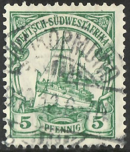 | Keywords: DRCol 1906 SWA MiNr25 B002.jpg Stamp of the German Empire - German colonies - German South West Africa; 1906; colonial ship drawing<br /> Stamp Michel No 25; Yvert Tellier No 27 DR-SWA 1906 ; AFA No 27 DR-SWA 1906 <br /> Color green to dark green<br /> Watermark Germany No 1 rhombs <br /> Nominal value 5 Pfennig<br /> Postage validity - 1906-06 1915-07-09 scan of original other date 1906-06 first issue of the stamp <br /> other date 1912-10 date of postmark Deutsche Reichspost - Deutsche Post in Deutsch-Südwestafrika PD-Namibia PD-Germany-§134-KUG PD-1923 <gallery> File GermanSouthwestAfrica5pf1906hohenzollern-coupon jpg The stame stamp Michel No 25 mint marginal piece of sheet with advertising vignette </gallery> Philately German colonial ship drawing; Imperial yacht SMS Hohenzollern other date 1906-06 Deutsche Reichspost - Deutsche Post in Deutsch-Südwestafrika Reichsdruckerei Berlin letterpress printing comb perforation K 14 14½ Deutsches Reich - Deutsche Kolonien Südwestafrika Nr 25 1906 stamps of German South-West Africa 25_2 SMY Hohenzollern on stamps of German South-West Africa |