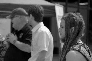 Keywords: blackandwhite black white bw monochrome street streetphotography downtown canada britishcolumbia bc okanagan kelowna summer blockparty dreads dreadlocks man male person