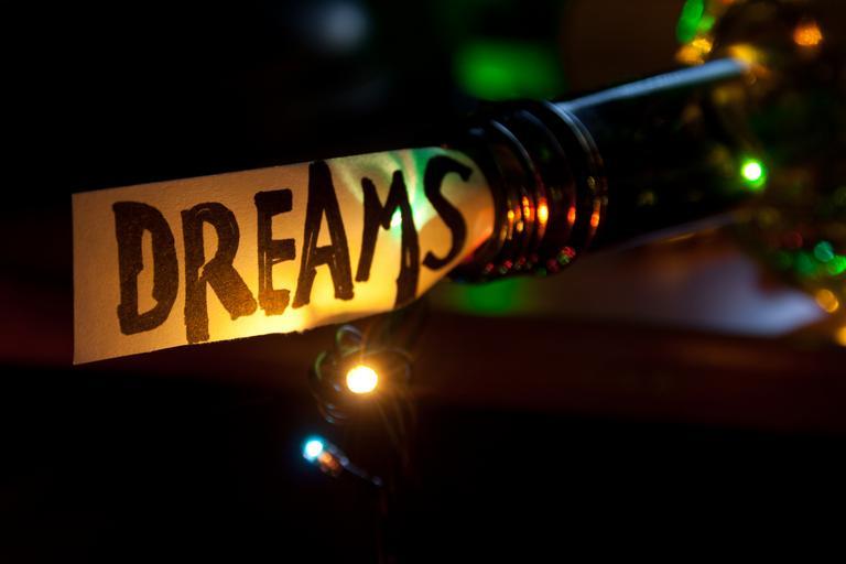 Keywords: dream; concept; happiness; magic; holiday; christmas; fantasy; beautiful; background; fairy; dreamlike; lights; paper; word; sign; glass bottle; text; tag