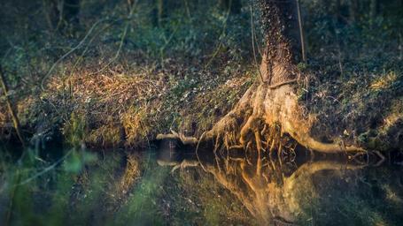 Keywords: dreamy forest sunlight tree root reflection lake river landscape nature water tree forest peaceful natural