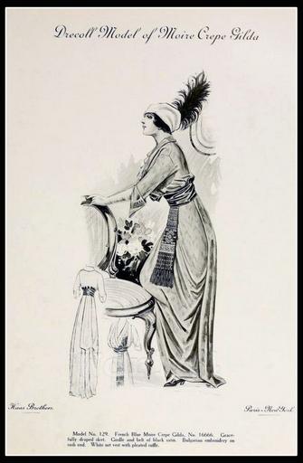 | Keywords: Drecoll Model of Moire Crepe Gilda. Paris Spring Season 1913.jpg en Fashion Design by Christoph Drecoll 1851 “1939 French Blue Moire Crepe Gilda Gracefully draped skirt Girdle and belt of black satin Bulgarian embroidery on sash end White net vest with pleated ruffle Cocktail dress by couturier Baron Christoph von Drecoll Published by Haas brothers 2014-05-06 10 22 18 http //world4 eu/tag/drecoll/ Christop Drecoll 1851-1939 PD-Art Uploaded with UploadWizard Christoph Drecoll Fashion in 1913 History of fashion in Paris Crepes fabric |