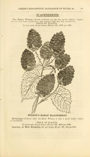 | Keywords: Dreer's descriptive catalogue of bulbs and other flower roots, with directions for their culture and management (16579447929).jpg DREER'S DESCRIPTIVE CATALOGUE OF BULBS c <br> 19 <br> BLACKBERRIES <br> The Early Wilson Stands foremost on the list as the earliest largest <br> st and most productive; this season's trial has fullv proved this <br> PRICE OF PLANTS <br> 73 cenfc each 58 per dozen 50 per 100 S400 per 1000 <br> mi - - K <br> WILSON'S EARLY BLACKBERRY <br> Kittatinny Follows after the Early Wilson is also a good variety highly <br> -ecornmended <br> PRICE OF PLANTS <br> 50 cents each 5 per dozen 30 per 100 050 per 1000 <br> Lawton or New Rochelle SI per dozen 5 per 100 25 perlOOO 42697257 136199 68229 Page 19 Text http //www biodiversitylibrary org/page/42697257 1867-8 10 1080/00222938209459753 Henry A Dreer Firm ; Henry G Gilbert Nursery and Seed Trade Catalog Collection Biodiversity Heritage Library Dreer's descriptive catalogue of bulbs and other flower root Garden Stories Catalogs Commercial catalogs Fruit trees Nurseries Horticulture Seeds Trees U S Department of Agriculture National Agricultural Library bhl page 42697257 dc identifier http //biodiversitylibrary org/page/42697257 Henry A Dreer bhlGardenStories Fruits BHLinbloom nurseries horticulture u s department of agriculture national agricultural library henry a dreer bhlgardenstories bhlinbloom Information field Flickr posted date ISOdate 2015-03-09 CC-BY-2 0 BioDivLibrary https //flickr com/photos/61021753 N02/16579447929 2015-08-24 01 53 51 cc-by-2 0 PD-old-70-1923 Dreer's descriptive catalogue of bulbs and other flower roots with directions for their culture and management Photos uploaded from Flickr by FĂŚ using a script |