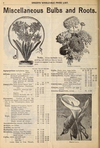 | Keywords: Dreer's wholesale price list (16578861567).jpg 6 <br> DREER'S WHOLESALE PRICE LIST <br> Miscellaneous Bulbs and Roots <br> Note Prices include duty 'A <br> packing and delivery free on board <br> freight or express lines in Philadel- <br> phia <br> Amaryllis Johnsonii <br> Double anemones <br> Perdoz Per 100 Per 1000 <br> Agrapanthus umbellatus bine 1 00 8 00 <br> white 2 00 15 00 <br> Allium aureum moly luteum 10 50 4 50 <br> Hermetti graudiflorum 15 80 7 00 <br> Neapolitanum an excellent <br> variety for winter forcing <br> large clusters of delicate <br> white flowers 10 60 5 00 <br> Amaryllis Bella Donna Major rose 1 00 8 00 <br> Formosissima Jacobjean <br> Lily 50 4 00 <br> ' ' Johnsonii selected large bulbs 2 60 20 00 <br> One 2 00 15 00 <br> Regina 2 00 15 00 <br> Vitatta Hybrids 40c ea 4 00 <br> ' ' Valotta purpurea 2 50 <br> Auemone Flowers of both the <br> double and single sorts found a ready <br> sale in the Philadelphia stores last <br> spring <br> Double Duchess of Lorraine deep rose <br> Harold bright blue <br> L'Eclair scarlet <br> White Ceres pure white <br> Rosette delicate rose <br> Double mixed all colors <br> Single Scarlet <br> White <br> Fulgens intense fiery scarlet <br> Single mixed all colors <br> Anomatlieca cruenta Scarlet Freesia <br> Arums see Callas <br> Astilbe see Spiraa <br> Babianas finest mixed ˘ <br> Brodisea coccinea Floral Fire Cracker <br> Volubilis TwiQiag Hyacinth <br> finest mixed <br> Calla white selected roots 1 <br> 1st size 1 <br> 2nd size <br> Little Gem or Tom Thumb <br> 30 <br> 2 00 <br> 30 <br> 2 00 <br> 30 <br> 2 00 <br> 30 <br> 2 00 <br> 30 <br> 2 CO <br> 15 <br> 1 00 <br> 8 00 <br> 15 <br> 60 <br> 5 00 <br> 15 <br> 75 <br> 7 00 <br> 30 <br> 2 00 <br> 18 00 <br> 10 <br> 50 <br> 4 50 <br> 20 <br> 1 00 <br> 7 50 <br> 30 <br> 2 00 <br> 35 <br> 2 50 <br> 75 <br> 6 00 <br> 15 <br> 1 00 <br> 25 <br> 9 00 <br> 85 00 <br> 00 <br> 7 50 <br> 70 00 <br> 75 <br> 6 00 <br> 55 00 <br> 75 <br> 6 00 <br> Per doz Per 100 Per 1000 <br> Calla Black true large bulbs <br> 1 00 7 <br> 00 <br> 60 <br> 4 <br> 00 <br> Calochortus finest mixed <br> 15 <br> 1 <br> 00 <br> Chionodoxa lucillae Glory of the Snow <br> 15 <br> 75 J 7 00 <br> gigantea <br> 15 <br> 1 <br> 00 8 50 <br> Sardensis intense blue <br> 15 <br> 75 7 00 <br> Tmolusi deep indigo <br> 20 <br> 1 <br> 25 10 GO <br> rosea rose new <br> 65 <br> 5 <br> 00 <br> Colchicum autumnale mixed Autumn Crocus <br> 40 <br> 2 <br> 50 <br> 40 <br> 2 <br> 50 <br> Crocus named varieties see page 5 <br> mixed 5 <br> Crown Imperials mixed <br> 75 <br> 5 <br> 00 <br> White Calla 45213545 161077 84662 Page 6 Text Summer Edition http //www biodiversitylibrary org/page/45213545 1898 Dreer Henry A Firm NameFound Agrapanthus umbellatus bine NameConfirmed Agapanthus umbellatus L'Her EOLID 1083810 NameFound Allium aureum NameConfirmed Allium aureum Lam EOLID 1084730 NameBankID 11167307 NameFound Anomatlieca cruenta NameConfirmed Anomatheca cruenta Lindl EOLID 5866081 NameBankID 5823009 NameFound Astilbe NameConfirmed Astilbe EOLID 11171526 NameBankID 2649623 NameFound Brodisea coccinea NameConfirmed Brodiaea coccinea A Gray EOLID 1087441 NameBankID 9327547 NameFound Calochortus NameConfirmed Calochortus EOLID 45417 NameBankID 2662473 NameFound Chionodoxa NameConfirmed Chionodoxa Boiss EOLID 1392558 NameBankID 471207 NameFound Colchicum NameConfirmed Colchicum L EOLID 33203 NameFound Formosissima NameFound Hermetti graudiflorum NameFound Neapolitanum NameFound Regina NameConfirmed Regina EOLID 35504 NameBankID 4935332 NameFound Valotta purpurea Biodiversity Heritage Library Dreer's wholesale price list / Garden Stories Bulbs Plants Catalogs Dreer Henry A Firm Nurseries Horticulture Nursery stock Pennsylvania Philadelphia Seed industry and trade Seeds Mertz Library The New York Botanical Garden bhl page 45213545 dc identifier http //biodiversitylibrary org/page/45213545 bhlGardenStories Flowers Double Anenomes Calla Amaryllis BHLinbloom bulbs plants dreer henry a firm nurseries horticulture mertz library the new york botanical garden bhlgardenstories double anenomes bhlinbloom Information field Flickr posted date ISOdate 2015-03-11 CC-BY-2 0 BioDivLibrary https //flickr com/photos/61021753 N02/16578861567 2015-08-24 21 56 13 cc-by-2 0 PD-old-70-1923 Calla Hippeastrum cultivars 1898 books Dreer's wholesale price list Photos uploaded from Flickr by Fæ using a script |