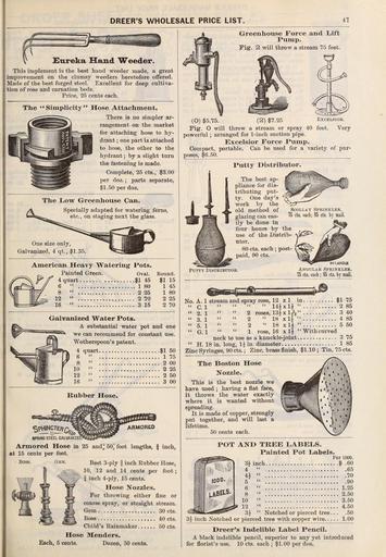 | Keywords: Dreer's wholesale price list (16578854987).jpg DREER'S WHOLESALE PRICE LIST <br> 47 <br> Unreka Hand Weeder <br> This implement is the best hand weeder made a great <br> improvement on the clumsy weeders heretofore ofifered <br> Made of the best forged steel Excellent for deep cultiva- <br> tion of rose and carnation beds <br> Price 25 cents each <br> The Simplicity Hose Attachment <br> There is no simpler ar- <br> rangement on the market <br> for attaching hose to hy- <br> drant ; one part is attached <br> to hose the other to the <br> hydrant ; by a slight turn <br> the fastening is made <br> Complete 25 cts 3 00 <br> per doz ; parts separate <br> 1 50 per doz <br> The Low Greenhouse Can <br> Specially adapted for watering ferns <br> etc on staging next the glass <br> One size only <br> Galvanized 4 qt 1 35 <br> American Heavy Watering- Pots <br> Painted Green Oval Round <br> 4 quart 1 45 1 15 <br> 6 1 80 1 45 <br> 8 2 25 1 80 <br> 12 2 70 2 25 <br> 16 3 15 2 70 <br> Galvanized Water Pots <br> A substantial water pot and one <br> we can recommend for constant use <br> Wotherspoon's patent <br> 4 quart 1 50 <br> 6 1 75 <br> 8 2 00 <br> 10 2 25 <br> 12 2 50 <br> 16 3 00 <br> Kubher Hose <br> Boss <br> Gem <br> C lf\mCTEJjQ W S JI ARMORED <br> aPRlNG STEEL GAIVANLZED ' <br> Armored Hose in 25 andj; 50 foot lengths inch <br> at 15 cents per foot <br> Best 3-ply f inch Rubber Hose <br> 'j;;/ 10 12 and 14 cents per foot ; <br> f inch 4-ply 15 cents <br> Hose Nozzles <br> For throwing either fine or <br> coarse spray or straight stream <br> Gem 30 cts <br> Boss 40 cts <br> Child's Rainmaker 50 cts <br> Hose Menders <br> Each 5 cents Dozen 50 cents <br> Greenhouse Force and Lift <br> Pump <br> Fig 2 will throw a stream 75 feet <br> O 5 75 2 7 25 Excelsior <br> Fig O wiU throw a stream or spray 40 feet Very <br> powerful ; arranged for 1-inch suction pipe <br> Excelsior Force Pump <br> Compact portable Can be used for a variety of pur- <br> poses 6 50 <br> Putty Distributor <br> The best ap- <br> pliance for dis- <br> tributing put- <br> ty One day's <br> work by the <br> old method of <br> glazing can eas- <br> ily be done in <br> four hours by the <br> use of the Distrib- <br> utor <br> 80 cts each ; post- <br> paid 90 cts <br> Putty Disteibutor <br> m9 ijvhglb <br> Angular Sprinkler <br> 75 cts each ; 85 cts by mail <br> No A 1 stream and spray rose 12 x 1 in 1 75 <br> CI 14 x1 2 85 <br> 2 1 2 roses 13 x1t\ 3 40 <br> 3 1 2 18 xli 4 85 <br> 5 1 2 18 xlj 5 50 <br> G 1 1 rose 16 x l With curved <br> neck to use as a knuckle-joint 3 75 <br> H 18 in long 1 in diameter 1 85 <br> Zinc Syringes 90 cts ; Zinc brass finish 1 10 ; Tin 75 cts <br> The Boston Hose <br> Nozzle <br> This is the best nozzle we <br> have used ; having a flat face <br> it throws the water exactly <br> where it is wanted without <br> spreading <br> It is made of copper strongly <br> put together and will last a <br> lifetime <br> 50 cents each <br> POT AND TREE LABELS <br> Painted Pot Labels <br> Per <br> 12 <br> 3 J Notched or pierced tree <br> 3J inch Notched or pierced tree with copper wire <br> 1000 <br> I 60 <br> 65 <br> 70 <br> 90 <br> 1 25 <br> 2 50 <br> 3 50 <br> 4 50 <br> 50 <br> 1 00 <br> Dreer's Indelible Label Pencil <br> A black indelible pencil superior to any yet introduced <br> for florist's use 10 eta each ; 1 00 per doz 45213459 161077 84662 Page 47 Text Winter Edition http //www biodiversitylibrary org/page/45213459 1898 Dreer Henry A Firm Biodiversity Heritage Library Dreer's wholesale price list / Garden Stories Bulbs Plants Catalogs Dreer Henry A Firm Nurseries Horticulture Nursery stock Pennsylvania Philadelphia Seed industry and trade Seeds Mertz Library The New York Botanical Garden bhl page 45213459 dc identifier http //biodiversitylibrary org/page/45213459 bhlGardenStories Flowers Garden Tools and Implements BHLinbloom bulbs plants dreer henry a firm nurseries horticulture mertz library the new york botanical garden bhlgardenstories garden tools and implements bhlinbloom Information field Flickr posted date ISOdate 2015-03-11 CC-BY-2 0 BioDivLibrary https //flickr com/photos/61021753 N02/16578854987 2015-08-24 21 53 44 cc-by-2 0 PD-old-70-1923 1898 books Dreer's wholesale price list Photos uploaded from Flickr by Fæ using a script |