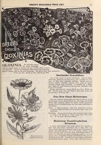 Keywords: Dreer's wholesale price list (16760263216).jpg DREER'S WHOLESALE PRICE LIST <br> GLOXINIA <br> We oifer this season <br> the finest Gloxinias <br> both as regards strain of variety and size of bulbs that we have <br> ever sent out All are well matured they are of the Crassifolia <br> tpye of foliage and are all erect flovfering The prices have been reduced to <br> 75 cts per doz ; 5 00 per 100 ; 40 00 per lOCO <br> Hklenium Gbandi- <br> CKPHALUM Striatum <br> Gaillardia Grandiflora <br> One of the finest of hardy Perennials Flovrers large <br> numerous produced on long stems and excellent for cut- <br> ting ; of the most gorgeous coloring Centre dark-red <br> brovyn ; petals variously marked with rings of scarlet <br> crimson orange and vermilion It delights in a rather <br> poor light soil and blooms in the greatest profusion from <br> June to November <br> Strong one-year-old clumps 1 00 per doz ; 8 00 per <br> 100 21 inch pots that will flower freely this season 60 <br> cts per doz ; 4 00 per 100 <br> Two New Giant Heliotropes <br> The two varieties listed below are what is known as the <br> Bruant type being characterized by very large individual <br> florets and immense sprays of bloom which frequently <br> measure 10 to 12 inches across and are grand additions to <br> this family <br> Czar A vigorous grower vnth dark stifi stems carrying <br> enormous trusses of bloom of an intense deep violet with <br> white eye <br> Czarina Strong robust stems and extremely large trusses <br> of extra sized flowers of deep indigo blue with white <br> eye 20 cts each ; 2 00 per dozen <br> Helenium Grandicephalnm <br> Striatum <br> A most interestingly old hardy plant that appears to <br> have been lost from cultivation for a long time has <br> only recently been re-iiitrodiiced and is oneof our most de- <br> sirable perennial plants It i s of strong robust erect <br> hahit growing from 8 to 4 feet high vdth flowers about 1 <br> inches in diameter in large branching heads of a deep <br> orange color irregularly striped and blotched with crimson <br> as Nhown in the cut A most novel and unique combination <br> and distribution of colors 25 cts each ; 2 50 per dozen 45213469 161077 84662 Page 37 Text Winter Edition http //www biodiversitylibrary org/page/45213469 1898 Dreer Henry A Firm Biodiversity Heritage Library Dreer's wholesale price list / Garden Stories Bulbs Plants Catalogs Dreer Henry A Firm Nurseries Horticulture Nursery stock Pennsylvania Philadelphia Seed industry and trade Seeds Mertz Library The New York Botanical Garden bhl page 45213469 dc identifier http //biodiversitylibrary org/page/45213469 bhlGardenStories Flowers Gloxinia Helenium BHLinbloom bulbs plants dreer henry a firm nurseries horticulture mertz library the new york botanical garden bhlgardenstories bhlinbloom Information field Flickr posted date ISOdate 2015-03-11 CC-BY-2 0 BioDivLibrary https //flickr com/photos/61021753 N02/16760263216 2015-08-24 21 50 56 cc-by-2 0 PD-old-70-1923 Gloxinia Unidentified Helenium 1898 books Dreer's wholesale price list Photos uploaded from Flickr by Fæ using a script