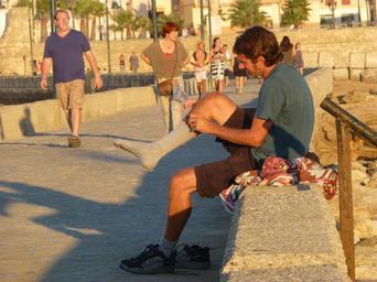 Keywords: dressing up man beach socks happy people fun person