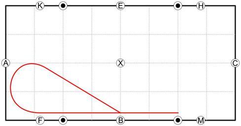Keywords: Dressurviereck - Aus der Ecke kehrt quer.svg Dressurviereck 20x40 Meter mit Bahnfigur Aus der Ecke kehrt rote Linie eingezeichnet Own 2006-08-28 Andreas 06 Category Riding figures Riding figures Half-pass
