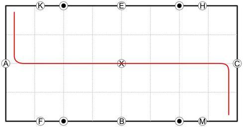 Keywords: Dressurviereck - Durch die Länge der Bahn wechseln quer.svg Dressurviereck 20x40 Meter mit Bahnfigur Durch die Länge der Bahn wechseln rote Linie eingezeichnet Own 2006-08-28 Andreas 06 Riding figures