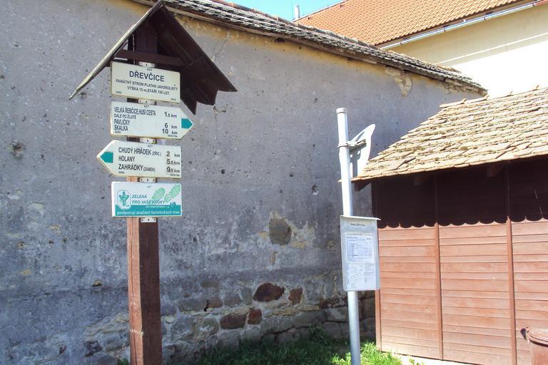 Keywords: Dřevčice 06.JPG cs Rozcestník ve středu obce ale platan je od něj 200 metrů daleko own Zákupák 2012-04-27 50 34 37 164 N 14 29 42 244 E region CZ Dřevčice Dubá Hiking and footpath fingerposts in Dubá