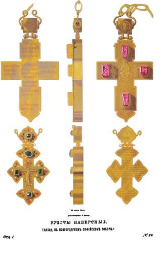 | Keywords: Drevnosti RG v1 ill025.jpg ru Д евности Российского госуда ства Antiquities of Russian country 1846 1853 Т 1 Иллюст ато Солнцев Фёдо Г иго ьевич Изоб аженные здесь под 24 два напе сных к еста в нату альную величину азличные по своей фо ме находятся в изнице новго одского Софийского собо а Один из них А се еб яный вызолоченный с филиг анью а лицевой сто оне изоб ажен вместо Распятия Господь Вседе житель сидящий на п естоле; четы е больших яхонта озового цвета в гнездах служат ук ашением а об атной сто оне вы езаны имена тех святых коих мощи заключаются в этом к есте Д угой из них B се еб яный вызолоченный с финифтью на лицевой сто оне и Распятием; в гнездах вставлены пять д агоценных камней а об атной сто оне его надпись показывает каких святых мощи вложены во внут енности его Оба сии к еста служили отличием сана святительского Судя по стилю пе вый из них д евнее последнего; по надписи не оп еделяют ни века их ни места ни соо удителя 1846 1853 http //www runiverse ru/bookreader/book403605/ page/61/mode/1up Солнцев Фёдо Г иго ьевич PD-Art Antiquities of Russian country - Volume I Files uploaded by Shakko from various sources Uploaded with UploadWizard Saint Sophia Cathedral in Novgorod objects Pectoral crosses from Russia |