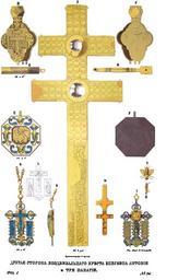 | Keywords: Drevnosti RG v1 ill027.jpg ru Д евности Российского госуда ства Antiquities of Russian country 1846 1853 Т 1 Иллюст ато Солнцев Фёдо Г иго ьевич Воздвизальный к ест епископа Антония 1212 г х анится в новго одском Софийском собо е Изоб аженный на эстампе под 25 к ест в половину уменьшенный п отив нату альной своей величины п инадлежит к числу воздвизальных кои возносимы были в собо ах и некото ых монасты ях на п аздник Воздвижения Честнаго и Животво ящаго К еста Различаясь местом и назначением своим от п естольных благословящих возлагаемых на п естоле; он х анился или в изнице или поставляем был в алта е на го нем месте Антониев к ест х анящийся в новго одском Софийском собо е сходен с полоцким св Евф осинии и с остовским Ав амиевым; он шестиконечный де евянный обложенный басменным золоченым се еб ом В шести клеймах на лицевой сто оне вычеканены изоб ажения Знамения Бого одицы Господа Вседе жителя двух хе увимов и св Иоанна Богослова ежду ними два к еста один мусийный восьмиконечный с аспятым Х истом ок уженный ликами Богомате и и св Иоанна Богослова или П едтечи а д угой с частицей Животво ящаго Д ева а боках к еста вычеканено о агиос Пет ос о агиос Павълос о агиос IBо о агиос Семьонъ и след надпись Господи помози абоu своїемu Антонu А хїепископu овго одьскuмu давшюмu к естъ Свmтой Софии Великий овго од изб ал Антония в 1211 г а хиепископом но че ез 8 лет изгнал его; потом вместе с ит офаном его п едшественником п едставил на суд мит ополиту Все оссийскому кото ый утве див ит офана в овго оде на Владычнем п естоле дал Антонию кафед у в Пе емышле После А сения овго од опять вызвал Антония на а хиепископию с кото ой он потом сошел в Хутынский монасты ь где и кончил жизнь свою и из исто ии ни из надписи не видно когда и по какому случаю соо ужен Владыкой овго одским этот к ест но по д евности более чем пятивековой по месту соо ужения и по лицу соо удителя этот надписанный памятник начала XIII в п инадлежит к любопытнейшим нашим д евностям Вместе с ним в изнице Софийского собо а находится т и панагии две а хиепископов новго одских и одна папская В С се еб яная складная с изоб ажением аспятия И Х а на д угой Спасителя E F се еб яная ук ашенная финифтью с об азом Святителя иколая H I к ест золотой с т емя п одолговатыми сквозными яхонтами на кото ых вы езано ельефом Распятие Иисуса Х иста с п едстоящими ему Богомате ью и Иоанном Богословом а т ех концах к еста изоб ажены т и пчелы по-видимому намекающие на слова Псалма CXVII 12 «Обыдоша мя яко пчелы сот» а с едок естии об атной сто оны солнце коего т ойственные лучи выступают и на д угую сто ону П и подножии к еста по снимку г Солнцева читаем надпись Urb VIII P M т е Urbanus VIII Pontifex Maximus о «Исто ическое описание Святыни овго одской» СПб 1848 г и новго одские «Губе нские Ведомости» 1848 г 9 ошибочно п иписывают этот к ест У бану IX и У бану XI Импе ат ицей Екате иной II это св ук ашение пожаловано было ит ополиту овго одскому и С -Пете бу гскому Гав иилу Пет ову а от него поступило в изницу Софийского собо а 1846 1853 http //www runiverse ru/bookreader/book403605/ page/61/mode/1up Creator Fedor Solntsev PD-old-auto-1923 1892 Antiquities of Russian country - Volume I Files uploaded by Shakko from various sources Uploaded with UploadWizard Saint Sophia Cathedral in Novgorod objects Altar crucifixes in Russia Anthony of Novgorod 1212 in Russia Gavriil Petrov Panagias Pectoral crosses from Russia |