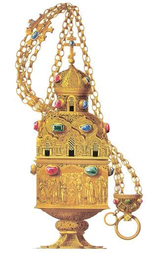 | Keywords: Drevnosti RG v1 ill039a.jpg ru Д евности Российского госуда ства Antiquities of Russian country 1846 1853 Т 1 Иллюст ато Солнцев Фёдо Г иго ьевич Золотое кадило сделанное по повелению ца я Федо а Иоанновича х анится в московском А хангельском собо е Кадило это д агоценное по металлу и по камням его ук ашающим авно и по искусной аботе весом 4 ф 33 1/2 золотн Чашке его с к ышкой дано художником подобие одноглавой це кви с ешетчатыми окнами и с восьмиконечным на главе к естом а внешних ее стенках между а абесками наведены че нью собо А хангела ихаила и лики святых в числе коих видны тезоименитые ца ю Федо у Иоанновичу и ца ице И ине св Федо Ст атилат и св мученица И ина В гнездах по местам вставлены изум уды и яхонты г аненые и нег аненые Четы е кольчатые цепи к коим п ик еплено кадило имеют в се едине четы е к еста с яхонтами; самая е данка или укоять из чистого золота богато ук ашена че нью и д агоценными каменьями Казалось масте истощил свое искусство чтобы сделать утва ь сию сколь можно великолепнее согласно с желанием усе дствовавшей особы Хотя в надписи на исунке и сказано что кадило сие ца я Федо а Алексеевича но на поддоне из узловатой надписи наведенной по золоту че нью узнаете что «кадило сие сделано повелением Благове ныя Великия Госуда ыни Ца ицы и Великия Княгини И ины во иноцех Александ ы по Великом Госуда е Ца е и Великом Князе Федо е Иоанновиче к его Ца скому г обу 1598 году» 1846 1853 http //www runiverse ru/bookreader/book403605/ page/61/mode/1up Солнцев Фёдо Г иго ьевич PD-Art Antiquities of Russian country - Volume I Files uploaded by Shakko from various sources Donations of Russian rulers to Church Thuribles from Russia Objects of Cathedral of the Archangel in Moscow Irina Godunova Feodor I of Russia's items |