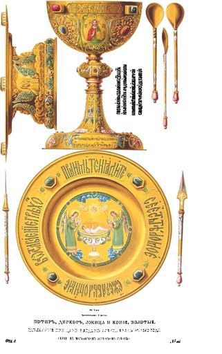 | Keywords: Drevnosti RG v1 ill067.jpg  ru Д евности Российского госуда ства Antiquities of Russian country 1846 1853 Т 1 Иллюст ато  Солнцев Фёдо Г иго ьевич Поти дискос лжица и копие золотые сделанные п и ца е Федо е Алексеевиче в 1680 г х анятся в московском Успенском собо е Поти этот высотой 8 3/4 ве шка с дискосом лжицей и копием из чистого золота ук ашен к упными изум удами и яхонтами  а чаше к оме надписания слов Спасителя у  атф XXVI 27  а ка XIV 23 и Луки XXII 20 наведены финифтью поясные изоб ажения Деисуса замечательные искусством  аботы так как и в шести клеймах на поддоне изоб ажения ст астей Х истовых Весом поти сей с п ибо ом 30 ф 58 золотн О в емени уст оения сей д агоценной утва и свидетельствует следующая на ней надпись Повелtнїемъ Великого Гд Іа m Ц `m иb Великогw Кнmзm Fеwдо а Аbлексtевича всеm великїm иb малыm Россїи иb бtлыm Самоде жца сїи сосuды златыm пост оены въ собо нuю Це ковь Успенїm П есвmтыm Бцbы в лtто /--з `пн 1680 1846 1853 http //www runiverse ru/bookreader/book403605/ page/61/mode/1up Солнцев Фёдо Г иго ьевич PD-Art Objects of Assumption Cathedral in Moscow Antiquities of Russian country - Volume I Chalices in Russia Files uploaded by Shakko from various sources Uploaded with UploadWizard Diskos from Russia Divine Liturgy spoons Spear liturgy 1680 in art Donations of Russian rulers to Church |
