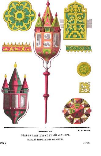 Keywords: Drevnosti RG v1 ill075.jpg ru Д евности Российского госуда ства Antiquities of Russian country 1846 1853 Т 1 Иллюст ато Солнцев Фёдо Г иго ьевич Ста инный це ковный фона ь находится в Воск есенском монасты е Этот выносной фона ь п инадлежит Воск есенскому монасты ю что называется овый Ие усалим; он уст оен из де ева обложенного вычу ными о наментами из меди и бляшками из олова Ему дано подобие це кви с шат овыми ве хами у коих недостает только к естов Вместо стекол вставлена слюда; затейливость и к асивость в целом и частях свидетельствуют об искусстве и тщательности художника По-видимому этот выносной фона ь относится ко в емени основателя ового Ие усалима икона Пат иа ха Самое название как и утва ь заимствованы из об ядника византийской це кви потому что значит «светец фона ь» Такие це ковные фона и в к естных хождениях носили пе ед св иконами или пе ед св да ами когда их п еп овождали из це кви в дом к опасно больным Они изоб ажены на ста инных св иконах и вст ечаются в це ковных описях так нап име в описи московского Успенского собо а 1628 г «фона ь слюдень к углой» Из его устава видно что п и пат иа хах упот еблялись в к естных хождениях фона и большой с едний и малый Ог омный фона ь с двуглавым о лом доныне обыкновенно носят в к естных ходах московских 1846 1853 http //www runiverse ru/bookreader/book403605/ page/61/mode/1up Солнцев Фёдо Г иго ьевич PD-Art Antiquities of Russian country - Volume I Files uploaded by Shakko from various sources Uploaded with UploadWizard Orthodox cross processional lanterns New Jerusalem monastery in art |