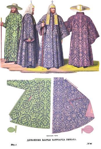 | Keywords: Drevnosti RG v1 ill096.jpg ru Д евности Российского госуда ства Antiquities of Russian country 1846 1853 Т 1 Иллюст ато Солнцев Фёдо Г иго ьевич Домашнее платье пат иа ха икона Вместе с це ковными облачениями святителей в московской Пат иа шей изнице уцелела и повседневная ходильная их одежда или яски по коим можно судить о пок ое платья о осте и стане пат иа хов Такие четы е яски одни из двоемо хого с двойным во сом а д угие из гладкого ба хата вишневого и таусинного темно-синего цвета подложенные тафтой и до огами т е шелковой полосатой тканью Две из них п иписанные икону Пат иа ху длиной 2 а шина с ши окими укавами а п очие две длиной 1 а шин 14 ве шков с узкими укавами Пе вые застегиваются шелковыми пуговицами от шеи по г удь а д угие во всю длину аз езных пол Шею обхватывает узкий оже елок из ба хата в оде во отничка а заглавном листе книги шведского посла Пет ея бывшего в оскве п и Самозванцах находим изоб ажение московского пат иа ха в яске сходной с вышеописанными Как пе вый пат иа х Иов тогда сослан был в заточение то ве оятно у Пет ея п едставлен лжепат иа х Игнатий в его обычном костюме В таких же ясах застегнутых пуговицами све ху донизу изоб ажены а хие еи на ка тинах ко онации ца я ихаила Федо овича Из жизни икона видим что ца ь Алексей ихайлович пожаловал святителю из своей ца евой изницы множество священных и внешних одежд Посему ве оятно и описанные нами ясы были не чем иным как ца скими становыми кафтанами об ащенными в ясы Такие же кафтаны или платна и кабаты иногда упот ебляемы были на саккосы П и с авнении пат иа ших ясок с ве хней ходильной одеждой ца ьг адских пат иа хов и с сутанами sottana имских пап ка диналов и п елатов отк ывается азительное сходство кото ое намекает нам о пе воначальном еди- нооб азии в облачениях Восточной и Западной це квей о так как сии ходильные одежды московских пат иа хов не составляют еще всего их на яда костюма то для дополнения его мы заимствуем сведения из г амот к оильных книг и описей пат иа шей домовой казны Из тех и д угих видно что одежда их была упот ебительная п и священнослужении и внешняя повседневная ходильная и ездовая или походная е касаясь здесь пе вой осмот им последнюю кото ая нам показывает внут енний быт и об аз жизни святителей онашеская ходильная одежда усских заимствованная от г еков сначала не азнилась пок оем и цветом у че нецов властей и а хие еев; она была нижняя и ве хняя как то власяницы или свиты ясы и мантии по большей части ко откие и клобуки с капты ем или кукули В Пече ском пате ике одежда иноческая соответствующая обету вольной нищеты называется че неческими убами В уставной г амоте Суздальского а хиепископа Дионисия 1382 г даже восп ещено монахам носить немецкие сукна и шубы ба аньи с пухом екото ые несущественные в ней изменения п оизошли от ее п испособления к климату и об азу жизни; посему в России и азличалось монашеское одеяние одно по г еческому а д угое по усскому обычаям как видно из Деяний осковского Собо а 1666-го и 1667 г где сказано «Одеяние монахом по Г еческому обычаю благословися; уко яющие таковое священства изве гаются» Ие а хи и власти возвышаясь над ядовыми че нецами отличались не столько пок оем цветом сколько богатством и великолепием внешней ходильной своей одежды так авно отличиями сана По свидетельству Гваньини писателя XVI в «платье у Епископов было че ное подобно п очим монах