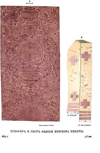 | Keywords: Drevnosti RG v1 ill101.jpg ru Д евности Российского госуда ства Antiquities of Russian country 1846 1853 Т 1 Иллюст ато Солнцев Фёдо Г иго ьевич Омофо и узо фелони епископа икиты Ризница новго одского Софийского собо а ук ашается д агоценными по д евности нетлению и святыне облачениями и утва ями новго одских святителей икиты и оисея Св мощи одного опочивают на вск ытии в этом собо е с 1107 г а д угого в Сково одском монасты е с 1329 г Св икита пост иженик Киево-Пече ского монасты я подвижник затво ник и чудотво ец по сме ти овго одского епископа св Ге мана изб ан и поставлен был на святительский п естол в овго оде в 1096-м или 1097 г ; п еставился 31 янва я 1107 г П и отк ытии св мощей его в 1550 г найдено на нем облачение сох анившееся нетленным в могиле где оно лежало 450 лет Все облачение состоит из фелони епит ахили по учей палицы штофных ко ичневого цвета га усного пояса омофо а из белого люст ина из синей г одету овой из плотной тафты шапочки опушенной го ностаевым мехом; на ней вышиты золотом к есты и се афимы со словами Сt афимъ Такая шапочка служила мит ой К этой епископской утва и XI в п инадлежит а хие ейский посох о коем ниже будет сказано и железные ве иги весом в 20 ф найденные на мощах Ие а ха В день отк ытия нетленных его останков п инесена была новго одцами ко г обу его железная лампада х анящаяся в изнице с к уговой п о езной надписью Свtча Великаго овго ода всtхъ п авославныхъ х естьянъ поставлена новому чудотво цу икитt въ лtто /--зk`s Ап tля въ л` день п и А хїепїскопt Пименt Белый клобук знаменитого а хиепископа овго одского Василия п едставляет нам не только памятник це ковной д евности возводимый безотчетным п еданием ко в еменам Константина Великого но и п едмет п итязаний владык новго одских на пе венство и п ений на Поместных Собо ах В 1352 г наглавие сие п ислано Ца ьг адским пат иа хом Филофеем пе вому Василию возведенному на степень а хиепископа из белых священников Васильев клобук вязанный из белого к ученого шелка состоит из капты я или полусфе ической шапочки с длинными отвесами ук ашен к упным жемчугом и яхонтами Долго подобное отличие было п инадлежностью одних владык новго одских потом п исвоено себе все оссийскими мит ополитами и пат иа хами Святитель оисей пе ед блаженной кончиной своей в 1329 г удалившийся в основанную им Сково одскую обитель оставил в Софийской сок овищнице памятники своего служения и подвижничества стяжанное им Евангелие свои железные ве иги и омофо изоб аженный на исунке 97 Св этот на амник из дымчатой шелковой мате ии с четы ехконечными к естами и вышитыми на к аях словами оисеа А хїепископа молитвами Святыя Софїи 1846 1853 http //www runiverse ru/bookreader/book403605/ page/61/mode/1up Солнцев Фёдо Г иго ьевич PD-Art Antiquities of Russian country - Volume I Files uploaded by Shakko from various sources Uploaded with UploadWizard Saint Sophia Cathedral in Novgorod objects Nicetas of Novgorod Phelonion Omophorion Birds and vases floral pattern Birds and vases floral pattern Pomegranate floral pattern 12th-century textiles |