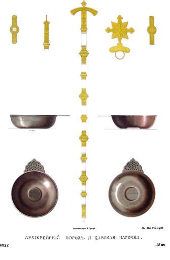 Keywords: Drevnosti RG v1 ill105.jpg ru Д евности Российского госуда ства Antiquities of Russian country 1846 1853 Т 1 Иллюст ато Солнцев Фёдо Г иго ьевич А хие ейский посох и ца ская ча очка Ризница смоленского Успенского собо а х анит в себе два памятника усе дия ца ей ихаила Федо овича и Алексея ихайловича а хие ейский посох и ковшичек для вливания теплоты Один окован се еб ом с чеканными вызолоченными яблоками и с к естом наве ху попе ечины Д угой се еб яный с надписью означающей имя венценосного вкладчика; на дне его вы езан двуглавый о ел с двумя ко онами на головах а на д угой сто оне слова «вес м 40 золотников» 1846 1853 http //www runiverse ru/bookreader/book403605/ page/61/mode/1up Солнцев Фёдо Г иго ьевич PD-Art Files uploaded by Shakko from various sources Antiquities of Russian country - Volume I Uploaded with UploadWizard Charka Donations of Russian rulers to Church Cathedral of the Dormition Smolensk Bishops' canes Russia |