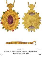 | Keywords: Drevnosti RG v1 ill111.jpg ru Д евности Российского госуда ства Antiquities of Russian country 1846 1853 Т 1 Иллюст ато Солнцев Фёдо Г иго ьевич Панагия в А хие ейской изнице Владими ского Рожествена монасты я С еди св утва ей из азных веков в А хие ейской изнице Владими ского Рожествена монасты я находим святительскую се еб яную вызолоченную панагию XVII в Она достопамятна сколько богатством ук ашений столько же и искусством аботы В се едине ее вставлен камей из оникса мутно-лилового цвета с зеленоватыми полосками изоб ажающий Спасителя; вок уг его в клеймах лики двенадцати апостолов в том числе четы ех евангелистов под видом ангела о ла льва и тельца а возглавии вычеканен об аз Спаса е укотво ного Вок уг как камея так и ободка насажены в гнездах винисы х изоп азы изум уды и жемчужины а об атной сто оне вок уг к еста идет в четы е яда следующая надпись кото ая указывает нам не только год но и соо удителя этой утва и ы ее п едложим здесь по снимку г Солнцева Лtта /--з `аf ояб я въ к`s день п и дt ъжавt бл`говt наго Ц я ї великаго Князя ихаила Fедо овича всеm Русїи и п и Ст`tйшемъ Пат їа хt Фила етt икитїче осковскомъ ї всеа Русїи по повелtнїю ихъ Гд` скаго богомольца Ве ейскаго ит ополита Аве кїя Панагия сия относится к тому в емени когда Владими с Лухом и Го охов- цем были го одами Пат иа шей области В 1624 г а хиепископом Суздальским и Та усским в исто ии ие а хии показан Иосиф а п еемником его с 1634 г Се апион Остается между п авлением того и д угого десятилетие никем не занятое Что же касается до мит ополита Ве ийского Аве кия то епа хией его были или Ве ия в области Константинопольского пат иа ха или Си ийский Алеппо в д евности называвшийся Ве ией и впоследствии п инадлежавший к Ца ьг адскому пат иа хату Так в числе мит ополитов Восточной це кви подписавших г амоту на поставление пе вого осковского пат иа ха Иова находился Ве ийский мит ополит Акакий Поэтому п едполагать можно что п иехавший из Ве ии мит ополит Аве кий в ца ствование ихаила Федо овича уст оил сию панагию от щед от ца ских и пат иа ших ожет статься что мит ополиту Ве ийскому Аве кию п едоставлена была пат иа хом Фила етом в уп авление Суздальская епа хия между 1624-м и 1634 г П име тому был в 1589 г когда Владими п едлагал в уп авление Ца ьг адскому пат иа ху Ие емии Если это так то панагия оставлена Аве кием на память в изнице Рожествена монасты я где Владими ские ие а хи изд евле имеют свое местоп ебывание 1846 1853 http //www runiverse ru/bookreader/book403605/ page/61/mode/1up Солнцев Фёдо Г иго ьевич PD-Art Files uploaded by Shakko from various sources Antiquities of Russian country - Volume I Panagias Uploaded with UploadWizard Monastery of the Nativity of the Theotokos Vladimir |