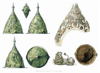 | Keywords: Drevnosti RG v3 ill017-018.jpg Авст ийский пода очный шлем Поднесён Павлом Сапегой от польского ко оля Сигизмунда III Фёдо у Иоанновичу Х анящийся в О ужейной палате железный шлем под 48 в описных книгах 1687-го и 1701 г под заглавием «Шапки емецкие и Калмыцкие» помещен пе вым «Шапка чеканная золочена Цеса ское дело; в ней два клейма больших в них люди; в одном клейме человек бьет змея но выше клеем по о лу двоеглавому в них по человеку на коне; меж клеем по личине; пониже клеем четы е льва; и люди и о лы и личины и львы и змейки и т авки золочены А по нынешней пе еписи ч`є года и по осмот у та шапка п отив п ежних пе еписных книг сошлась; цена сто ублей» а этом стальном золоченом шлеме п евосходного чекана сов еменного искусству Бенвенуто Челлини на двух больших клеймах изоб ажен Ге кулес по ажающий Ле нейскую гид у и удушающий в бо ьбе великана Антея а вычеканенном ге бе усском в ве шине шишака над ко онованными главами о лов изоб ажен к ест Это ге б ца ства осковского во в емя пат иа шества п и Федо е Иоанновиче и следовательно абота шлема относится к этому в емени По выписке из посольских книг 1591 г польский ко оль Сигизмунд III п ислал ца ю в числе п очих да ов поднесенных Павлом Сапегой шелом золотен В этом да е можно п изнать изоб аженный на исунке железный золоченый шлем цеса ского дела Д евности Российского госуда ства < 1853 Солнцев Фёдо Г иго ьевич Author died more than 70 years ago - public domain PD-old Antiquities of Russian country - Volume III Shelom Feodor I of Russia's items |