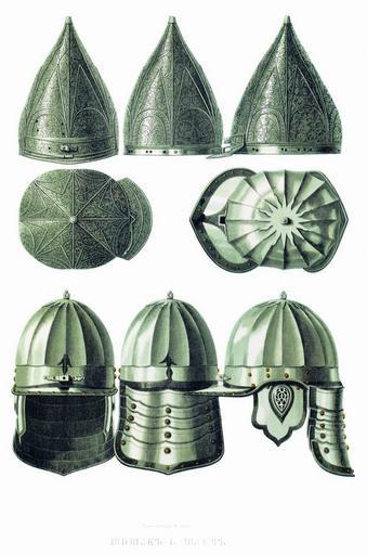 Keywords: Drevnosti RG v3 ill022.jpg Шишак и шлем Означенные на исунках 22 изоб 1 и 24 изоб 4 в описи О ужейной палаты отмечены в числе шишаков 9 и 10 но по фо ме наве шья уст оенного для вставки еловца или пе а это собственно шлемы как оные и названы в описной книге ца ской О ужейной казны 1687 г Чеканный восемью г анями с полук ужьями и клинцами над венцом записан пе вым Он был золочен и воо ужен наушниками и затылком как упомянуто из немецкого железа В п ежних книгах считался пятым; а изоб аженный на исунке 24 четве тым «Шолом чеканной г аненой; по венцу сплошь по половине к уга повыше к угов на г анях по клинцу; че ез к уг и че ез клинец и че ез г ань золочено; ветчан; наушки и затылок немецкаго железа пок ыты зеленым ба хатом; завязки отлас че вчат А по нынешней пе еписи ч`є года 1687 и по осмот у тот шолом п отив п ежних пе еписных книг сшолся; завязок нет; цена шестьдесят ублев а в п ежней описной книге написан пятой» «Шолом ветчан по чекану золочен; семь гвоздей се еб яных епейчатых; наушки и затылок немецкаго железа пок ыты ба хатом че вчатым; завязки отлас че вчат А по нынешней пе еписи ч`є года и по осмот у тот шолом п отив п ежних пе еписных книг сшолся; цена т идцать ублев а в п ежней описной книге написан четве той же» Изоб аженная на исунке 22 под чеканным шлемом ложчатая латная шапка есть собственно латный шишак кото ому соответствует в описи 1687 г 4 «шишак лощатой наушки п о езные затылок дощатой железный гвоздье медные Д евности Российского госуда ства < 1853 http //john-petrov livejournal com/1169742 html Солнцев Фёдо Г иго ьевич Author died more than 70 years ago - public domain PD-old Antiquities of Russian country - Volume III Files uploaded by Shakko from various sources