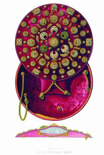 Keywords: Drevnosti RG v3 ill071 - Shild of State.jpg Госуда ственный щит Изоб аженный госуда ственный щит п инадлежит к чину ца скому и выносится п и то жественных поставлениях на ца ство Он кожаный обтянутый алым ба хатом Пос едине или вве ху щита к углый х устальный плащ в золоте с в езанными в золотых гнездах шестнадцатью яхонтиками Вок уг с еднего плаща шесть подобных же плащей два из них зеленого х усталя но с п о езами сбоку для вставки гнезд с д агоценными камнями кото ых однако же недостает Эти плащи обставлены четы надцатью золотыми гнездами заключающими в себе изум уды яхонты и би юзу и восемью яшмовыми обделанными в золото косичками в кото ых в каждой по т и яхонта За ними следует яд состоящий из двенадцати к углых с п о езами и золотой обделкой яшмовых плащей и двенадцати косичек с в езными в золотых гнездах яхонтами и би юзами За этим ядом следует яд меньших яшмовых плащей также ук ашенных золотой насечкой и яхонтами и между ними двенадцать золотых гнезд с т емя яхонтами и девятью би юзами По ок аине щита шесть яшмовых с яхонтиками и золотой насечкой блях шесть к углых яшмовых подобных вышеупомянутым плащей и двенадцать золотых гнезд с яхонтами и би юзой В попе ечнике щита 13 1/2 ве шков Д евности Российского госуда ства http //john-petrov livejournal com/1190678 html Солнцев Фёдо Г иго ьевич < 1853 PD-old Antiquities of Russian country - Volume III Files uploaded by Shakko from various sources |
