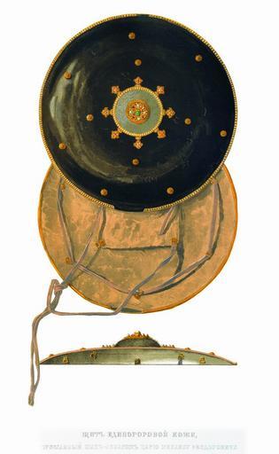 | Keywords: Drevnosti RG v3 ill074 - Shield from Inrog.jpg Щит пода ил посол пе сидского шаха Аббаса II Ага Ассан ца ю ихаилу Фёдо овичу 29 декаб я 1644 года «Щит кожа ин оговая че ная; на ве ху щита плащ к углой би юза в золоте на нем запона к углая золотая в запоне камень изум уд да четы е зе на кафимских бу мицких да четы е яхонтика да шестнадцать иско ок яхонтовых же че вчатых да т идцать две би юзки да около би юзнаго плаща семьдесят одно зе но жемчужных да т и места по озжих; да около того ж плаща восемь епьев золотых в том числе в т ех по пяти яхонтиков че вчатых да по семи би юзок маленьких в том числе место би юзное по озжо; в т ех же епьях по жемчужному зе ну бу мицкому кафимскому да в двух епьях по изум уду; около зе ен и изум удцов по четы е яхонтика че вчатых да по семи би юзок маленьких; одиннадцать епьев золотых п ик еплены петли золотые ж; около щита венец золотой во многих местех попо чен в нем жемчужных двести девяносто семь зе ен девять мест по озжих; подложен косматым шелком под петлеми к ужечки золотые ж; чемоданец ба хат Пе сидской золотой подложен до огами двоелишными В чемоданце в бумаге выполое жемчужное зе нышко да изум удная иско ка По записным книгам написано «Великому Госуда ю п ислал в да ех Кизылбашской шах Оббас в н`в году; цена сто пятьдесят один убль двадцать алтын» А по нынешней пе еписи ч`є года и по осмот у тот щит п отив п ежних пе еписных книг сшолся вве ху в к угу и в кайме двадцати одново жемчуга нет» Д евности Российского госуда ства < 1853 Солнцев Фёдо Г иго ьевич Author died more than 70 years ago - public domain PD-old Antiquities of Russian country - Volume III |