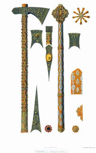 | Keywords: Drevnosti RG v3 ill079 - Topor i Buzduhan.jpg Топо и буздыхан В описи О ужейной палаты значится под 3 се еб яный с позолотой Девять п о езных пе ьев обсажены сна ужи би юзой Чеканеный че ен в узо по золоченому полю се еб яные с че нью обводы и в них золоченые цветы По че ену два пояска и ве хняя и нижняя оконечности пе ната ук ашены би юзой яхонтами и изум удами Д евности Российского госуда ства http //john-petrov livejournal com/1190678 html Солнцев Фёдо Г иго ьевич < 1853 PD-old Antiquities of Russian country - Volume III Files uploaded by Shakko from various sources Battle axes of Russia |