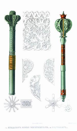 Keywords: Drevnosti RG v3 ill081.jpg А буздыхан князя Бо ятинского Б шестопе В описи 1687 г под названием «пе ната о шести пе ьях» «Пе нат о шти пе ах на пе ье п о езаны т авы и поставлены в лице об учи вызолочены п иве нуты щу упами в об уче по т и щу упа железные; на ве ху ко уна с яблоком п о езным вызолочены а на ве ху яблока малинькие яблочки железные не золочены; под пе ьем яблоко с по езкою; в лице под яблоком п ием медной п о езной позолочен; посе едь яблока и от яблока укоятка г аненая позолочена; повыше исподнева яблока спуск медной п о езной позолочен и п иве нут одним щу упом; яблоко че ез г ань п о езано; под исподом яблока поставлено в лице с пуговкою пуговка сквозная» Д евности Российского госуда ства http //john-petrov livejournal com/1190678 html Солнцев Фёдо Г иго ьевич < 1853 PD-old Antiquities of Russian country - Volume III Files uploaded by Shakko from various sources House of Baryatinsky |