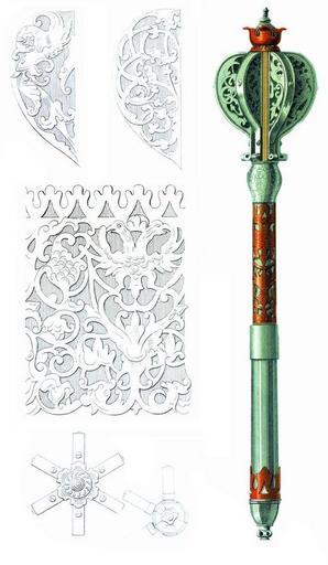 Keywords: Drevnosti RG v3 ill081b - Shestopior.jpg Шестопё «Пе нат о шти пе ах на пе ье п о езаны т авы и поставлены в лице об учи вызолочены п иве нуты щу упами в об уче по т и щу упа железные; на ве ху ко уна с яблоком п о езным вызолочены а на ве ху яблока малинькие яблочки железные не золочены; под пе ьем яблоко с по езкою; в лице под яблоком п ием медной п о езной позолочен; посе едь яблока и от яблока укоятка г аненая позолочена; повыше исподнева яблока спуск медной п о езной позолочен и п иве нут одним щу упом; яблоко че ез г ань п о езано; под исподом яблока поставлено в лице с пуговкою пуговка сквозная» Д евности Российского госуда ства < 1853 Солнцев Фёдо Г иго ьевич Author died more than 70 years ago - public domain PD-old Antiquities of Russian country - Volume III Ceremonial maces Flanged maces Maces of Russia Pernach |