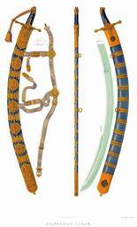 | Keywords: Drevnosti RG v3 ill092 - Sabres.jpg en Hungarian-stylized russian sabre ru «Сабля полоса на Уго ской выков осковское дело; на полосе долики мелкие голомя ножны поволочены гзом че ным оп ава на ножнах и набалдашник и огниво се еб яные езные золоченые с че нью в пятнадцати местех т авы в езаны на об ез; пояс тесма шолк че вчат зелен с золотом и с се еб ом; оп ава на поясу се еб яная золоченая семнадцать мест; темляк и кисть шолк че вчет с золотом ва во ка обнизана жемчугом А по нынешней пе еписи ч`є года и по осмот у та сабля п отив п ежних пе еписных книг сошлась Цена той сабли пятьдесят один убль а по п ежней описной книге та сабля написана т идцать пятая» Д евности Российского госуда ства http //www belygorod ru/img2/Solncev/Used/0StarinnyeSabli jpg Солнцев Фёдо Г иго ьевич < 1853 PD-old Antiquities of Russian country - Volume III Scimitars Sabres of Russia Gurda |