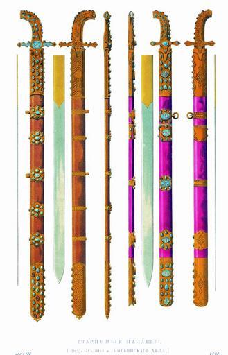 | Keywords: Drevnosti RG v3 ill094 - Palash.jpg en Moskow backswords before 1687 ru Два палаша осковского п оизводства Из описи 1687 <br /> «Полаш полоса стальная осковскаго дела; от к ыжа по обе сто оны золочено; к ыж и че ен се еб еные т авчатые; устье пять б анца наконешник т авы чеканные золочены; на че ену ж и на к ыже и на устье и на б анца ах и на наконешнике сто двенадцать би юз; ножны пок ыты ба хатом алым; пояс тесма шолковая цветная А по нынешней пе еписи ч`є года тот полаш с п ежними пе еписными книгами сшолся а по осмот у и по п ежним пе еписным и по нынешним книгам четы надцать би юз да в наболдашнике би юзы ж и колец нет Цена пятьдесят два убли а в п ежних пе еписных книгах написан десятым» <br /> «Полаш полоса стальная осковскаго дела от к ыжа по обе сто оны золочено; че ен и к ыж и устье пять обоймиц наконешник се еб еные золочены; на че ену ж и на к ыжу и на устье и на обоймицах и на наконешниках в гнездах семнадцать би юз в них в езывано золото с иск ы яхонтовыми по счету пятнадцать иско ок да т и места по озжи у одной обоймицы и гнезда золото и иск ы выпадали; около тех гнезд шестьдесят одна би юза кольцо у обоймицы се еб еное золочено а у д угова кольца нет отломлено; ножны пок ыты ба хатом че вчетым без пояса А по нынешней пе еписи ч`є года тот полаш с п ежними пе еписными книгами сшолся по нынешней пе еписи объявился; тесьма шолк цветной; цена со ок пять ублев а в п ежних пе еписных книгах написан т етьим надесять» Д евности Российского госуда ства http //www belygorod ru/img2/Solncev/Used/0StarinPalashi_3 jpg Солнцев Фёдо Г иго ьевич < 1853 Antiquities of Russian country - Volume III Swords of Russia Broadswords PD-old |