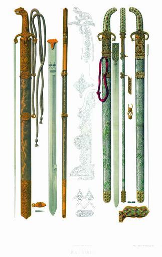 Keywords: Drevnosti RG v3 ill097 - Palash.jpg ru Палаши «Да све х п ежней описной книги полаш полоса булатная на ней с обе сто оны по два дола с обе сто оны два до конца а два до ельмана с опушкою; на п авой сто оне мишень с отметцы; ножны поволочены ба хатом алым; оп ава на нем че нь и к ыж и устье две обоймицы и кольцы и наконешник золотые; пояс столпчатой шолк к асной Цена тому полашу двести т идцать ублев» «Полаш полоса стальная в езывано золото т авы че ен яшмовой ножны поволочены ба хатом цветным; земля се еб еная оп ава на ножнах золотая в че ену и в оп аве в езывано золото ж с каменьи П ислан в О ужейной п иказ из Посольскаго п иказа во н`г году 1645 декаб я во в день; а в памяти за п иписью дьяка Степана Куд явцова написано «Куплен у Семена Волынскаго дан сто ублев» А по нынешней пе еписи ч`є года 1687 и по осмот у тот полаш п отив п ежних книг сшолся по обе сто оны в езывано золото че ен яшмовой оп ава золотая; к ыж устье и наконешник два б анца а с одной сто оны в золоте яшмы а с д угой с че нью; в че ену в наконешнике яшмы по обе сто оны; в че ену ж и в оп аве девяносто камешков и иско ок яхонтовых че вчатых и изум удных; в наболдашнике изум уд г аненой; по п ежним пе еписным книгам четы е места по озжих поясу нет А по нынешней пе еписи ч`є года и с п ежними десять мест по озжих А по нынешней же оценке тому полашу цена сто шестьдесят ублев а по п ежней описной книге написан тот полаш пе вым» en Palashes Д евности Российского госуда ства < 1853 Солнцев Фёдо Г иго ьевич Author died more than 70 years ago - public domain PD-old Antiquities of Russian country - Volume III Swords of Russia Broadswords