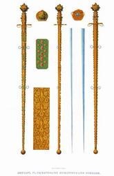 | Keywords: Drevnosti RG v3 ill101.jpg Конча с се еб яными позолоченными ножнами В описи О ужейной палаты под 2; в описной книге 1687 г под тем же номе ом «Конче на полосе с обе сто оны было золочено до половины; на ножнах оп ава хоз се еб ен золочен езной на нем т инадцать яшм а в яшмах в золоте шестьдесят две иск ы яхонтовых да двадцать мест по озжих сто шестнадцать би юз да два места по озжих; на конце яблоко к углое витое; на ножнах пять обоймиц да четы е кольца; на ве хнем устье над к ыжем в к угу пять яшм а в них одиннадцать иско яхонтовых в золоте да семь мест по озжих; да п омеж яшм т и би юзы да место по озжо да под к ыжем над устьем и около яшмы т и би юзы да на че ену и в ве хнем яблоке больших и малых пятьдесят би юз четы е места по озжи А по нынешней пе еписи ч`є года тот конче с п ежними пе еписными книгами сшолся и по осмот у в яшмах на ножнах и с п ежними двадцати семи иско нет; над к ыжем в яшмах осьми иско нет да в че ену пяти би юз нет; пояса нет кольца железные; цена тому конче у сто пятьдесят ублев а по п ежней описной книге написан четве тым» Д евности Российского госуда ства http //john-petrov livejournal com/1190678 html Солнцев Фёдо Г иго ьевич < 1853 PD-old Antiquities of Russian country - Volume III Files uploaded by Shakko from various sources |