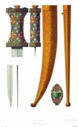 | Keywords: Drevnosti RG v3 ill107.jpg Кинжал Кинжал изоб аженный на исунке 107 х анится в О ужейной палате под 6 «Кинжал клинок булатный укоять и ножны золотые; наве ху укояти ук ашенной цветами из финифти находится большой изум уд по сто онам кото аго два финифтяных к асных епейка и цветы; на самой же укояти в двух ядах двадцать шесть изум удов и шесть мест по ожних Золотые ножны чеканены в узо ; на них недостает устья» Д евности Российского госуда ства http //john-petrov livejournal com/1190678 html Солнцев Фёдо Г иго ьевич < 1853 PD-old Antiquities of Russian country - Volume III Files uploaded by Shakko from various sources Knives of Russia |