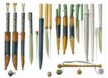 | Keywords: Drevnosti RG v3 ill109-110 - Podsaad Knifes.jpg en Under-saadak knifes ru Ца ские охотничьи ножи названные в описях подсаадачными Д евности Российского госуда ства Солнцев Фёдо Г иго ьевич 1801 1892 < 1853 thumb left File Plet DRG jpg PD-old Antiquities of Russian country - Volume III Knives of Russia |