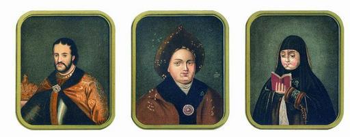 | Keywords: Drevnosti RG v4 ill009z.jpg Д евности Российского госуда ства 215 По т еты А ца я Иоанна Алексеевича Б ца евны а га иты Алексеевны В ца ицы Евдокии Федо овны Эти по т еты сняты с х анящихся в московской О ужейной палате по т етов писанных масляными к асками в XVII столетии Пе вый олицетво яет нам сына ца я Алексея ихайловича Иоанна Сей ца евич с 1682 г ца ь скончался 29 янва я 1696 г на 30-м году от ождения По сказанию сов еменных ему писателей он был «весьма слабого здо овья болен глазами и близо ук»1 Бледное болезненное лицо его на по т ете подтве ждает это свидетельство Иоанн изоб ажен в б оне све х коей надета шуба в аспах застегнутая на г уди запоной из д агоценных камней П ед ним лежит на столе ко она ца ская С по т ета сего ца я х анящегося в Кунсткаме е Академии наук п иложен литог афи ованный п отивень к «Исто ическому описанию одежды и воо ужения оссийских войск» ч I а д угом по т ете изоб ажена дочь ца я Алексея ихайловича а фа в инокинях а га ита скончавшаяся 19 июля 1707 г на 55-м году от ождения2 Она пог ебена в усыпальнице Александ овского Успенского монасты я где над г обницею поставлен по т ет сей ца евны по свидетельству п офессо а Шевы ева «имеющий большое сходство с Пет ом Великим и Ца ем Алексеем ихайловичем»3 о на п иложенном здесь по т ете не видно такого сходства ни с отцом ни с б атом Ца евна изоб ажена в светском на яде по обычаю своего века голова у нее пок ыта т еухом или шапкой с собольим околышем; под ним обыкновенно висел подзатыльник низанный жемчугом Шуба на ней с отложным собольим во отником и запоной на г уди Т етий по т ет п едставляет пе вую суп угу Пет а I Евдокию Федо овну из ода Лопухиных дочь Ила иона Аб амовича кото ый по д евнему обычаю с возведением его в чин боя ина пе еименован был Федо ом а ца ская невеста Па аскевия его дочь Евдокиею Судьба сей ца ицы известна из исто ии Пет а I писанной под его влиянием Здесь видим Евдокию в инокинях Елену в одеянии невольной че ницы кото ое она носила около 30 лет с 1689-го по 1727 г пе еводимая из монасты я в монасты ь под ст огим надзо ом как п еступница Забытая всеми она достигла 58-го года своей жизни о с восшествием на п естол ее внука Пет а II Елена получив свободу из Успенского Ладожского монасты я пе еехала в оскву и там заменила иноческую изу ца ской одеждой Для нее оп еделен был особый п идво ный штат Она пе ежила ко онование об учение и п еждев еменную кончину своего внука; п еставилась 27 августа 1731 г на 62-м году жизни и пог ебена в собо ной це кви Вознесенского девичьего монасты я http //john-petrov livejournal com/1328766 html century 19 Д евности Российского госуда ства PD-old-100 Eudoxia Lopukhina as nun parsuna Ivan V of Russia in portraits 17th-century portraits of Russia Antiquities of Russian country - Volume IV Files uploaded by Shakko from various sources Marfa Alexeevna |