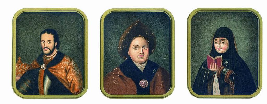 Keywords: Drevnosti RG v4 ill009z.jpg Д евности Российского госуда ства 215 По т еты А ца я Иоанна Алексеевича Б ца евны а га иты Алексеевны В ца ицы Евдокии Федо овны Эти по т еты сняты с х анящихся в московской О ужейной палате по т етов писанных масляными к асками в XVII столетии Пе вый олицетво яет нам сына ца я Алексея ихайловича Иоанна Сей ца евич с 1682 г ца ь скончался 29 янва я 1696 г на 30-м году от ождения По сказанию сов еменных ему писателей он был «весьма слабого здо овья болен глазами и близо ук»1 Бледное болезненное лицо его на по т ете подтве ждает это свидетельство Иоанн изоб ажен в б оне све х коей надета шуба в аспах застегнутая на г уди запоной из д агоценных камней П ед ним лежит на столе ко она ца ская С по т ета сего ца я х анящегося в Кунсткаме е Академии наук п иложен литог афи ованный п отивень к «Исто ическому описанию одежды и воо ужения оссийских войск» ч I а д угом по т ете изоб ажена дочь ца я Алексея ихайловича а фа в инокинях а га ита скончавшаяся 19 июля 1707 г на 55-м году от ождения2 Она пог ебена в усыпальнице Александ овского Успенского монасты я где над г обницею поставлен по т ет сей ца евны по свидетельству п офессо а Шевы ева «имеющий большое сходство с Пет ом Великим и Ца ем Алексеем ихайловичем»3 о на п иложенном здесь по т ете не видно такого сходства ни с отцом ни с б атом Ца евна изоб ажена в светском на яде по обычаю своего века голова у нее пок ыта т еухом или шапкой с собольим околышем; под ним обыкновенно висел подзатыльник низанный жемчугом Шуба на ней с отложным собольим во отником и запоной на г уди Т етий по т ет п едставляет пе вую суп угу Пет а I Евдокию Федо овну из ода Лопухиных дочь Ила иона Аб амовича кото ый по д евнему обычаю с возведением его в чин боя ина пе еименован был Федо ом а ца ская невеста Па аскевия его дочь Евдокиею Судьба сей ца ицы известна из исто ии Пет а I писанной под его влиянием Здесь видим Евдокию в инокинях Елену в одеянии невольной че ницы кото ое она носила около 30 лет с 1689-го по 1727 г пе еводимая из монасты я в монасты ь под ст огим надзо ом как п еступница Забытая всеми она достигла 58-го года своей жизни о с восшествием на п естол ее внука Пет а II Елена получив свободу из Успенского Ладожского монасты я пе еехала в оскву и там заменила иноческую изу ца ской одеждой Для нее оп еделен был особый п идво ный штат Она пе ежила ко онование об учение и п еждев еменную кончину своего внука; п еставилась 27 августа 1731 г на 62-м году жизни и пог ебена в собо ной це кви Вознесенского девичьего монасты я http //john-petrov livejournal com/1328766 html century 19 Д евности Российского госуда ства PD-old-100 Eudoxia Lopukhina as nun parsuna Ivan V of Russia in portraits 17th-century portraits of Russia Antiquities of Russian country - Volume IV Files uploaded by Shakko from various sources Marfa Alexeevna