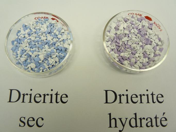 Keywords: Drierite indicateur.JPG fr Drierite avant et après adsorption d'humidité en Drierite - brand name and registered trademark - desiccant made from calcium sulfate gypsum - with color indicator own Brière2 2011-03-09 thumb left Cc-zero Desiccants Calcium sulfate |