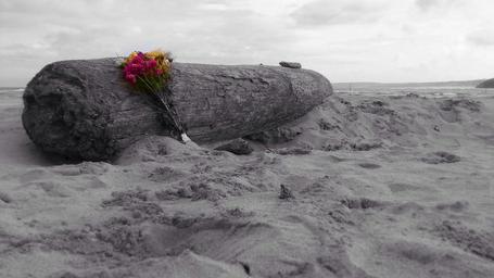 Keywords: driftwood beach ocean sand flowers