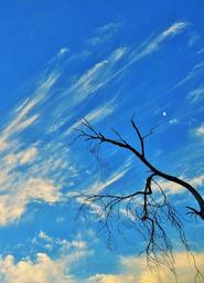 Keywords: dry branch tree dry dead branches twigs stylish twisted moon half sky blue cloud white streaky