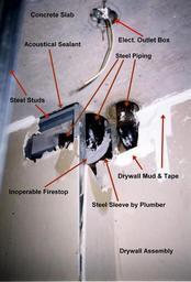 | Keywords: Drywall firestop problem1.jpg This is typical passive fire protection problem This wall is supposed to have a fire-resistance rating It does not because the firestop is inoperable The plumber followed his instructions to the letter by providing a perfectly useless Section 15050 Schedule 40 sleeve for one of the penetrants a steel pipe His insulator shoved in some packing and smeared in some firestop silicone Two other penetrants did not get sleeved because the sleeve did not fit so they were just left The drywaller tried to mud up to the resulting mess and there is no way the result will stop any smoke or fire The problem started with having each sub-trade do its own firestopping and not insisting on a separate firestop sub-trade working for the general contractor with clear penetration sizing and shaping guidelines As it is this mess destroys the fire protection plan originally set out by the architect Own 2007-05-27 Achim Hering Plumbing Silicones Caulking Firestops Drywalls Certified firestop materials - incorrect installation Firestop specification problem Broken workscope Building code violations Compromised drywall |
