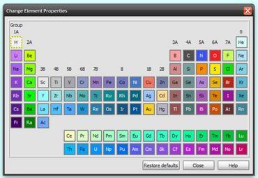 | Keywords: DS Visualizer preferred settings colours.png s Colour code 505050 Carbon C black<br> F0F0F0 Hydrogen H white<br> F51E1E Oxygen O red<br> 3C50FA Nitrogen N blue<br> D8FCF8 Helium He cyan<br> CD7EFF Lithium Li lilac<br> C5FF00 Beryllium Be yellow-green<br> FAA0A0 Boron B pink<br> C8FA64 Fluorine F yellow-green<br> AFE3F4 Neon Ne cyan<br> AA5EF2 Sodium Na lilac<br> 89FF00 Magnesium Mg green<br> D28C8C Aluminium Al pink-brown<br> 78A0A0 Silicon Si blue-grey<br> FA8C00 Phosphorus P orange<br> FAEB00 Sulfur S yellow<br> 12DC12 Chlorine Cl green<br> 81D1E4 Argon Ar sky blue<br> 8F41D3 Potassium K purple<br> 3DFF00 Calcium Ca green<br> E6E6E4 Scandium Sc grey<br> C0C3C6 Titanium Ti grey<br> A7A5AC Vanadium V grey<br> 8898C0 Chromium Cr grey-blue<br> 9878C0 Manganese Mn grey-blue<br> 8078C0 Iron Fe grey-purple<br> 7078C0 Cobalt Co grey-blue<br> 4876C2 Nickel Ni grey-blue<br> F67561 Copper Cu pink-orange<br> 747FA9 Zinc Zn blue-grey<br> AA7878 Gallium Ga pink-brown<br> 699191 Germanium Ge blue-grey<br> B482DC Arsenic As lilac<br> EBB400 Selenium Se yellow-brown<br> B42814 Bromine Br red-brown<br> 5DBAD1 Krypton Kr teal<br> 712EB2 Rubidium Rb green<br> 00FF00 Strontium Sr green<br> 96FDFF Yttrium Y cyan<br> 96E1E1 Zirconium Zr light blue<br> 74C3CB Niobium Nb light blue<br> 50B4B0 Molybdenum Mo teal<br> 389CA8 Technetium Tc teal<br> 018C90 Ruthenium Ru dark teal<br> 0B7C8C Rhodium Rh dark teal<br> 006881 Palladium Pd teal<br> 99C6FF Silver Ag silvery blue<br> FFD891 Cadmium Cd peach<br> A06464 Indium In brown<br> 5A8282 Tin Sn blue-grey<br> AA5ABE Antimony Sb lilac<br> DC8200 Tellurium Te brown<br> 961496 Iodine I purple<br> 429FB0 Xenon Xe teal<br> 57198F Caesium Cs purple<br> 00CB00 Barium Ba green<br> 70DEFF Lanthanum La light blue<br> F7FCCA Cerium Ce cream<br> D9FFC8 Praseodymium Pr light green<br> C6FFC8 Neodymium Nd light green<br> A4FFC8 Promethium Pm light green<br> 92FFC8 Samarium Sm light green<br> 63FFC8 Europium Eu aqua<br> 47FFC8 Gadolinium Gd aqua<br> 32FFC8 Terbium Tb aqua <br> 1FFFB7 Dysprosium Dy aqua<br> 00FF9D Holmium Ho aqua<br> 00E776 Erbium Er green<br> 00D353 Thulium Tm green<br> 00C039 Ytterbium Yb green<br> 00AD23 Lutetium Lu green<br> 4DC2FF Hafnium Hf blue<br> 4DA7FF Tantalum Ta blue<br> 2094D0 Tungsten W blue<br> 277EAC Rhenium Re blue<br> 206890 Osmium Os dark blue<br> 185480 Iridium Ir dark blue<br> 005791 Platinum Pt dark blue<br> F8D020 Gold Au gold<br> B5B5C3 Mercury Hg grey<br> 965050 Thallium Tl brown<br> 4B7373 Lead Pb blue-grey<br> A032A0 Bismuth Bi purple<br> C85000 Polonium Po brown<br> 643232 Astatine At dark brown<br> 428497 Radon Rn teal<br> 420066 Francium Fr dark purple<br> 007C00 Radium Ra dark green<br> 71AAFC Actinium Ac blue<br> 00BBFF Thorium Th blue<br> 00A1FF Protactinium Pa blue<br> 0092FF Uranium U blue<br> 0081F2 Neptunium Np blue<br> 006BF2 Plutonium Pu blue<br> 555BF2 Americium Am violet<br> 785BE3 Curium Cm violet<br> 894FE3 Berkelium Bk purple<br> A137D5 Californium Cf purple<br> B31FD5 Einsteinium Es purple<br> B31FBA Fermium Fm pinkish purple <br> B30DA7 Mendelevium Md pinkish purple<br> BD0D87 Nobelium No pink<br> C90066 Lawrencium Lr pink<br> 2015-03-02 own DS Visualizer Jynto talk 'Annotated' version cc-zero Images by Jynto Screenshots_of_free_software Screenshots_of_Windows_software Periodic table |