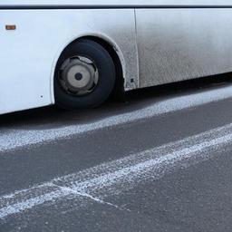 Keywords: cropped hip_to_crop_square hiptocropsquare bus white white_bus whitebus wheel road asphalt snow geometry rather_minimal ratherminimal dirt gradient vehicle outdoor